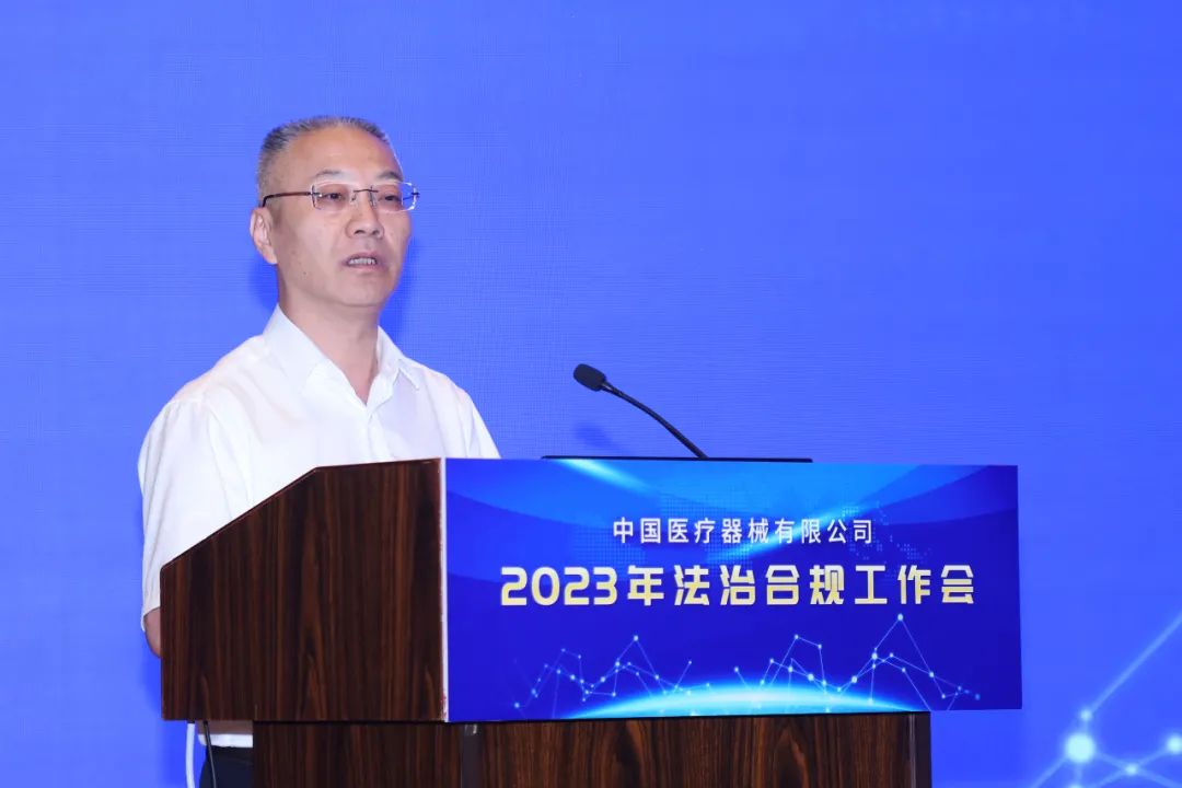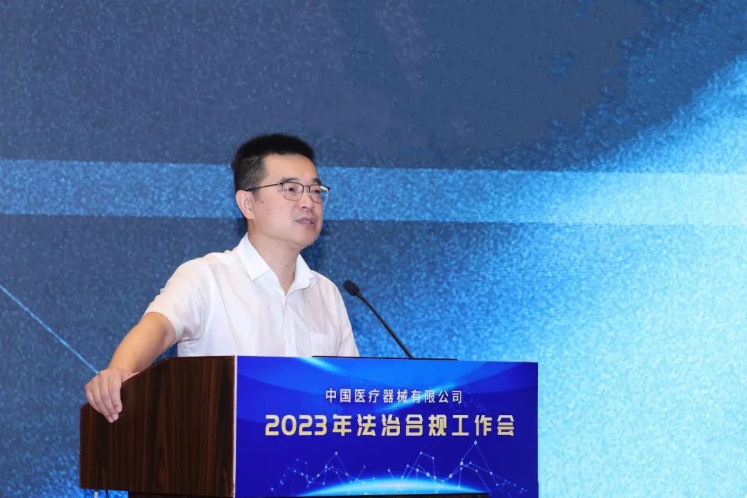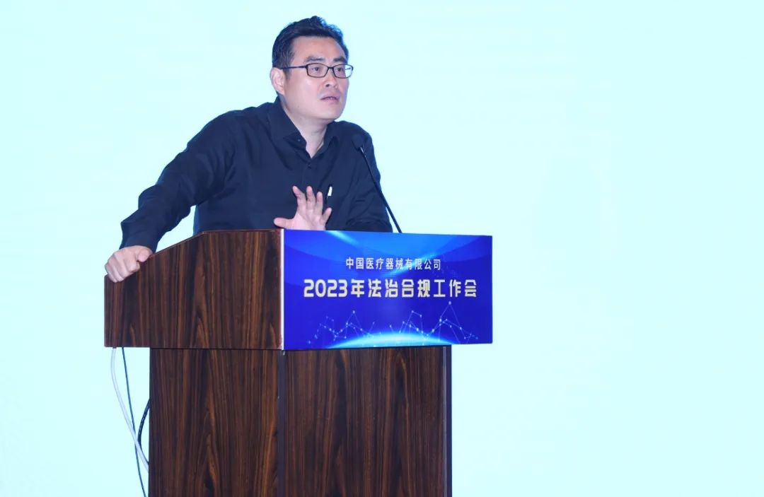 国药器械副总经理、总法律顾问、首席合规官宋飞在会上做了国药器械法治合规工作报告。宋飞从顶层制度设计、法律合规一体化、合规管理体系建设、纠纷案件处置、普法培训等方面对法治合规工作进行了系统总结,并结合当前政策要求,对下一阶段法治合规工作进行了部署,提出将合规工作与经营工作结合起来、联动起来,不仅要让合规保发展,更要让合规成为企业发展的新动能。