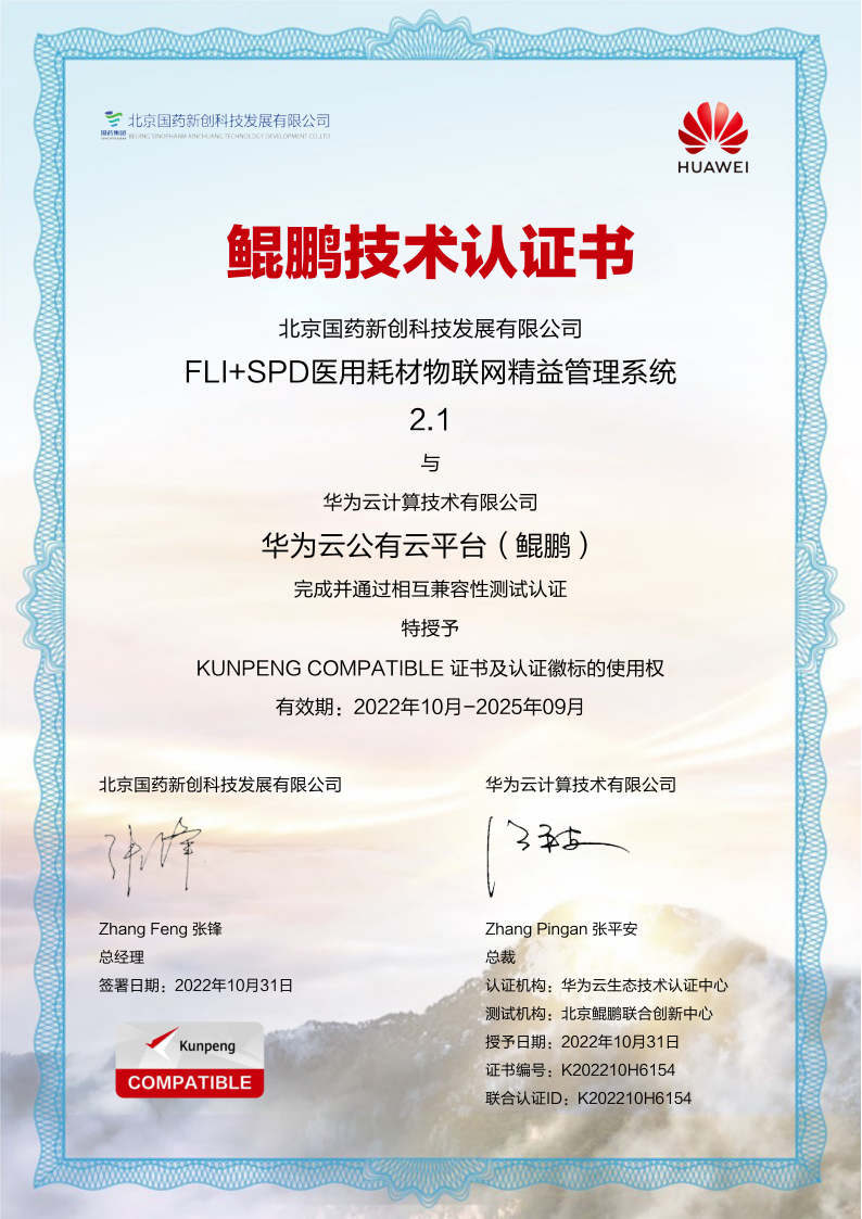 ▲鲲鹏技术证书:国药新创FLI+SPD医用耗材物联网精益管理系统2.1
