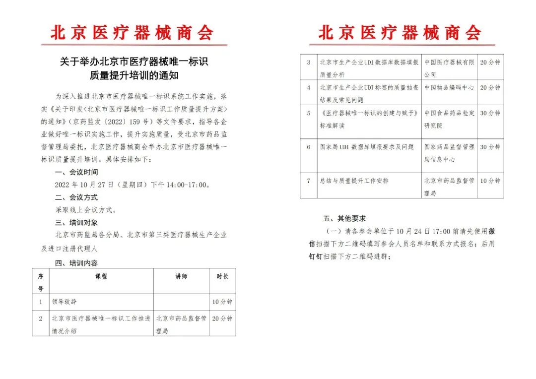 此次培训邀请国家药品监督管理局信息中心、国家药品监督管理局器械标管中心、中国食品药品检定研究院、北京市药品监督管理局相关领导,中国医疗器械有限公司、中国物品编码中心UDI相关专家进行授课,由北京医疗器械商会组织实施。
