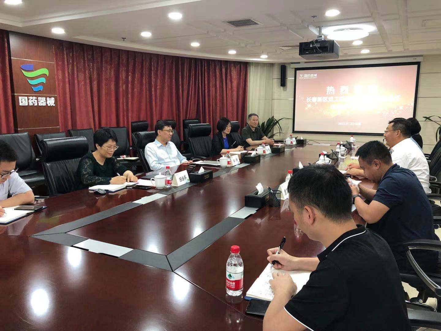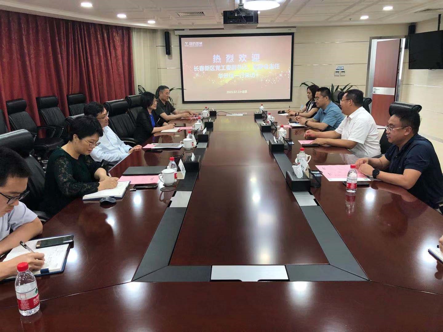 2021年7月22日下午,国药器械董事长、党委书记李杨会见长春新区党工委副书记、管委会主任华景斌一行。长春新区发改工信局副局长王东升,国药器械总经理助理、北区事业部总经理邵璐,国药器械工业与科研管理部部长、国药器械研究院副院长任海萍参加会见。