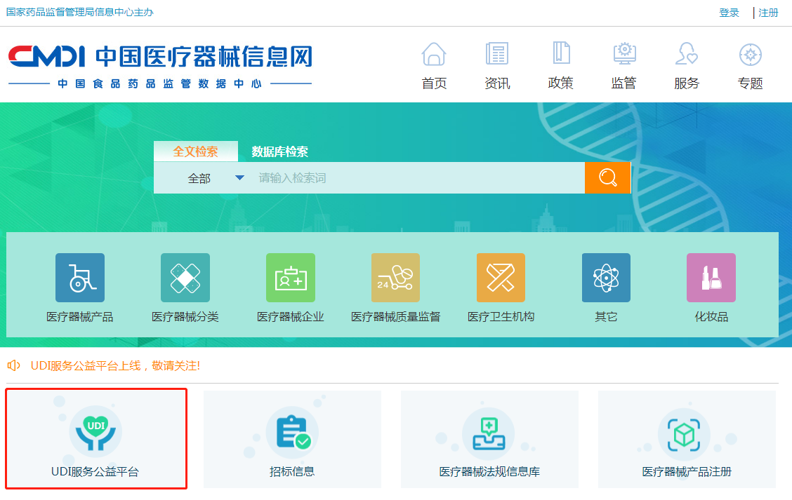 用户打开中国医疗器械信息网(http://www.cmdi.org.cn/)首页,然后点击“UDI服务公益平台”,或直接在浏览器输入网址http://udi.cmic.com.cn/udi,实现一键直达。用户注册后就可以使用平台。