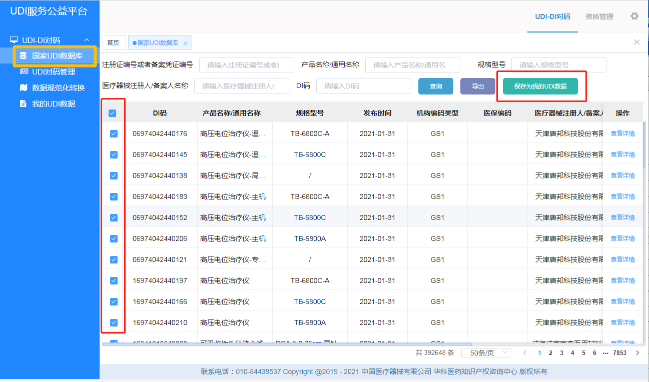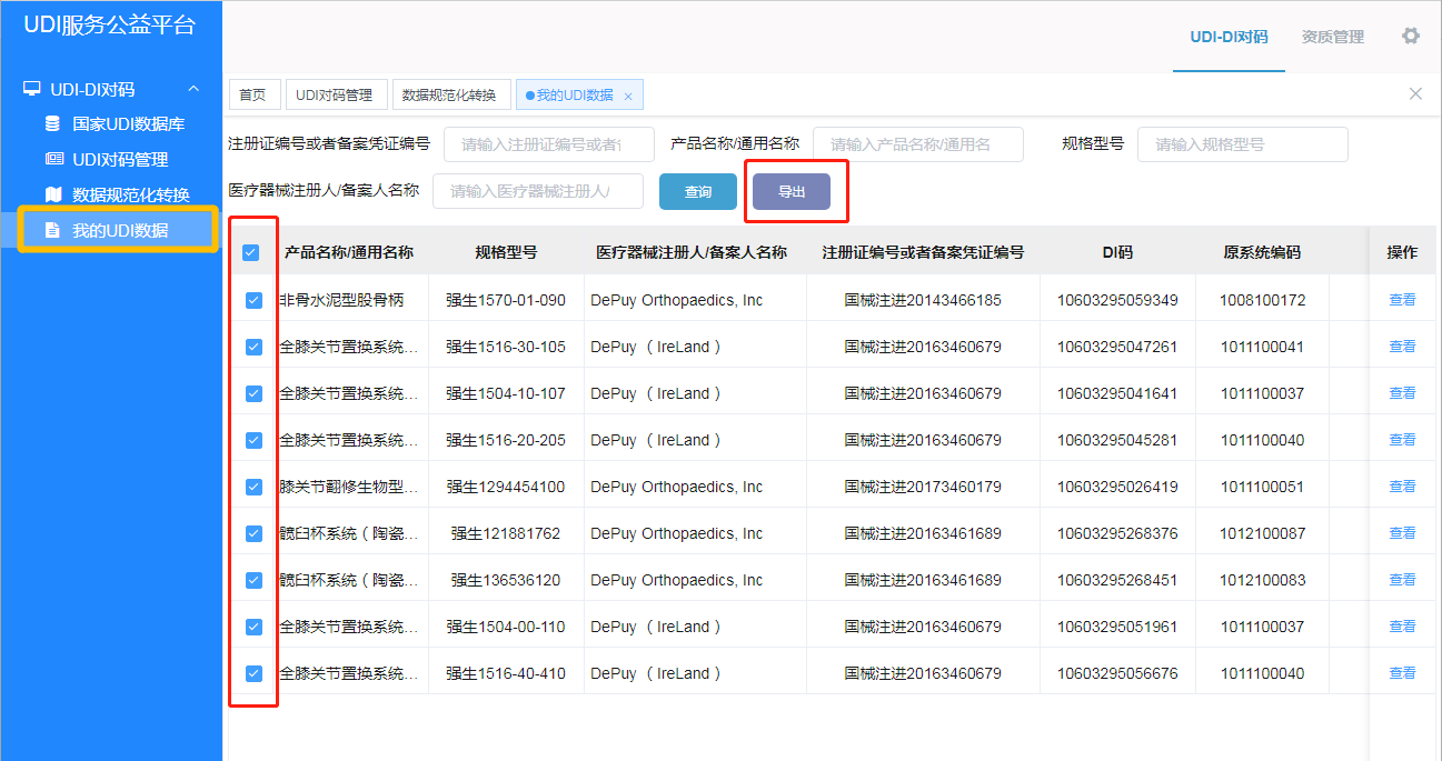 数小妹:平台登录后,在左侧菜单栏里,找到“我的UDI数据”模块,可以导出数据,再去医院的信息系统做DI应用。