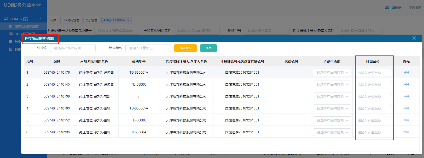 数小妹:注册登录平台后,第一种方式是,从国家UDI数据库里直接选取自己需要的数据,“保存为我的UDI数据”,在弹出窗口中可补充计量单位等字段信息,完成后点击“保存”,之后便可在“我的UDI数据”模块下查看或导出数据,导出后就直接可以去应用这些UDI数据哦。