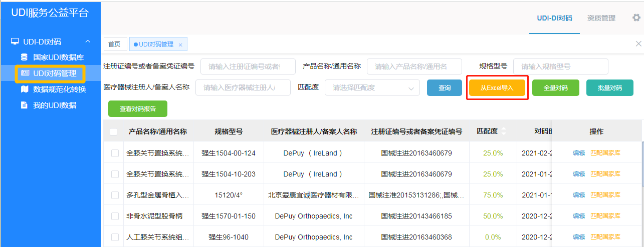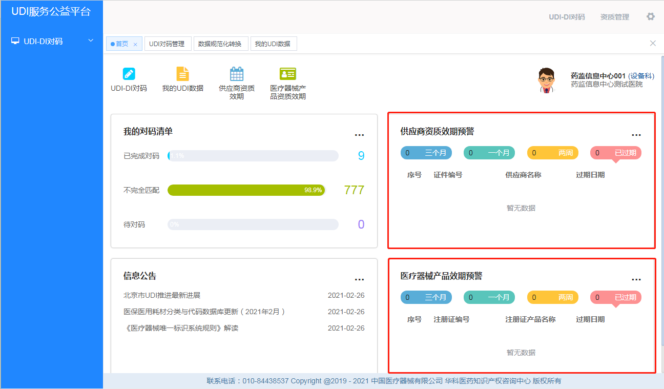 2019年7月,国家药监局会同国家卫生健康委联合印发《医疗器械唯一标识系统试点工作方案》,拉开我国医疗器械唯一标识系统建设序幕。随着医疗器械唯一标识工作的推进,许多大型医疗机构积极推动UDI实施,有效提升了院内耗材管理信息化、精细化水平,减少了用械差错。经实践发现,医疗机构在实施UDI时,首先要面临院内耗材自有编码与国家UDI数据库DI码的对码工作。UDI服务公益平台针对这一难题,为医疗机构提供对码服务,加速医疗机构UDI的导入与应用实践。同时,平台还提供数据诊断和资质管理功能,帮助医疗机构强化基础数据标准化管理。