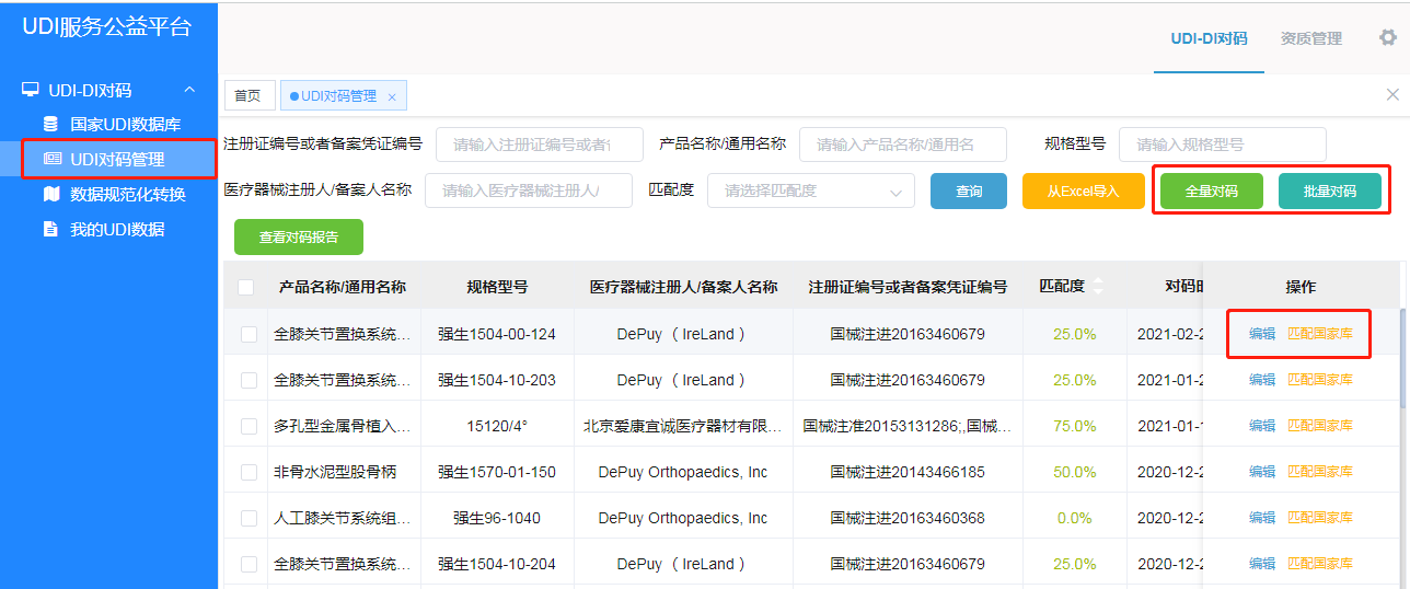 数小妹:UDI对码的入口多着呢,点击菜单左侧“UDI对码管理”,导航栏直接有“全量对码”、“批量对码”,选中需要对码的数据后直接点击就能对码;另外,导入的每条数据,都可通过“编辑”或者“匹配国家库”等操作,实现对单条数据的DI对码。