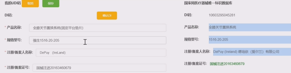 数小妹:你看一下以下图中的例子,有三个字段数据都有问题,一种选择是按照国家UDI库的数据手动修改完善医院数据。但如果仍想延用医院原有的数据信息,也可直接点击“确认DI”,便可以在保留医院原有数据不变的情况下直接获取DI码。