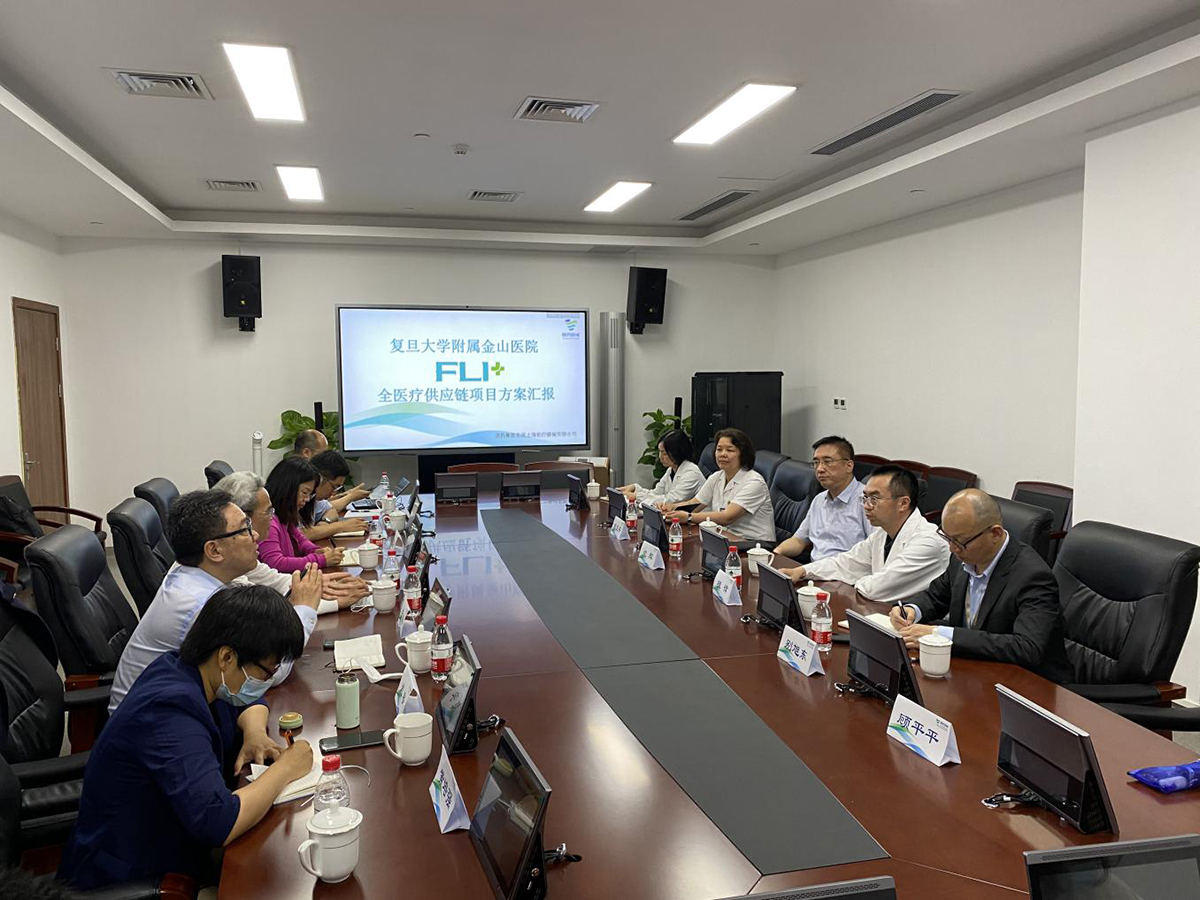 参观结束后,一行人来到金山医院科教楼,与复旦大学附属金山医院院长沈辉、副院长桂律、医疗装备部科长周卫萍、装备部副科长张勤进行座谈交流。会上蔡买松指出,国药正在大力推广SPD项目,以器械质量安全为先,着眼供应链效益,致力于降低成本。沈辉表示SPD项目是医院管理耗材的方向,项目从2018年开始到现在,效果显著,希望进一步做大数据分析,检验耗材管理的成效,并希望能够将金山医院打造成为金山和上海标杆,乃至全国的标杆。陈星表示项目的发展离不开金山医院的鼎力支持,经过两年的数据积累,将进一步提高效率。刘亚芝希望金山医院SPD项目进一步升级,加强不收费耗材管理,实现定数包管理,为医院作各项决策提供依据。